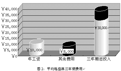 就中國目前的經(jīng)濟(jì)水平而言,一個(gè)座席人員年收入(包括工資、獎金、福利等等)大約為¥10,000,而每個(gè)座席人員所配備的軟硬件設(shè)施合計(jì)約為¥5,000;據(jù)專業(yè)機(jī)構(gòu)統(tǒng)計(jì),中國的座席人員平均穩(wěn)定的工作年限為三年,而在這三年為了保證座席人員能夠準(zhǔn)確、高效的實(shí)現(xiàn)對用戶提供專業(yè)服務(wù),所投入的培訓(xùn)費(fèi)用大約為¥3,000。所以在三年期間為每個(gè)座席的平均花費(fèi)為¥38,000。