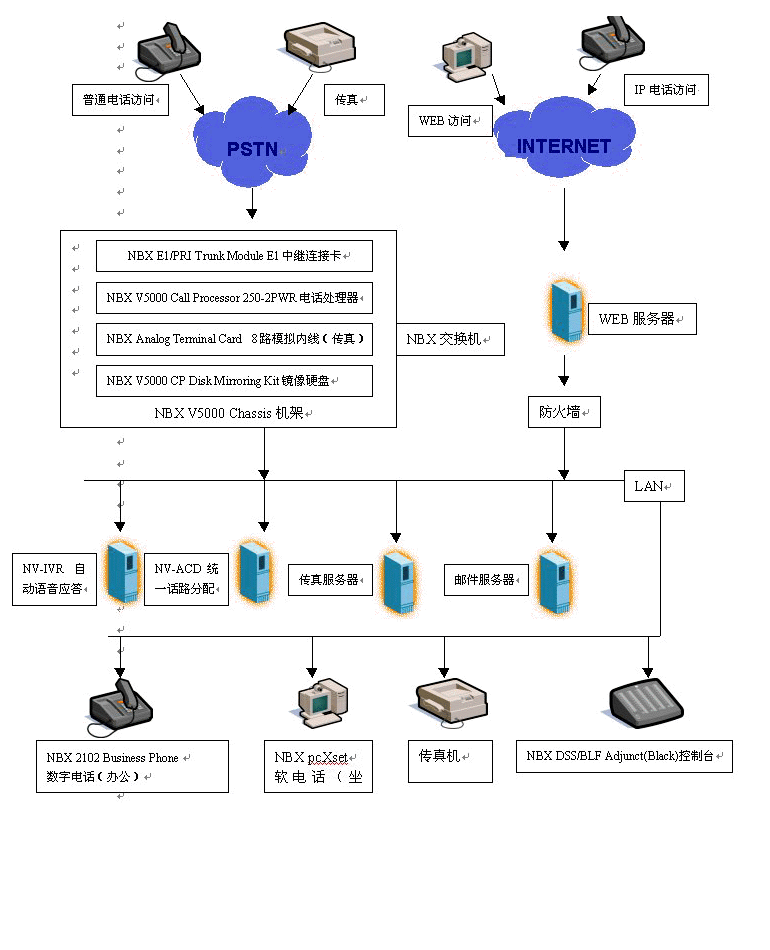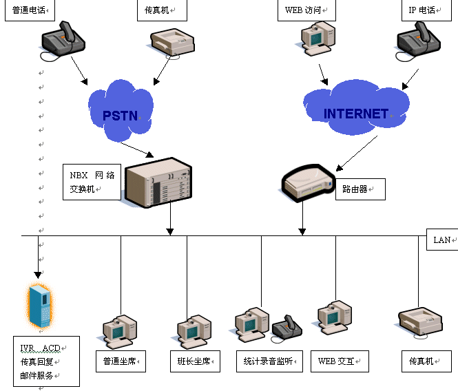 基于NBX的呼叫中心對(duì)外支持PSTN、IP兩種接入方式,可以實(shí)現(xiàn)各種接入:普通電話、傳真、IP電話、郵件、WEB訪問(wèn),NBX呼叫中心在技術(shù)上實(shí)現(xiàn)革命性的突破,在內(nèi)部實(shí)行語(yǔ)音數(shù)據(jù)兩網(wǎng)合一,從而實(shí)現(xiàn)外部各種訪問(wèn)的統(tǒng)一路由分配。
