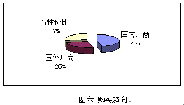 鑒于國內(nèi)并沒有知名度很高的CRM實(shí)施廠商,而國外的著名廠商在國內(nèi)的品牌宣傳也不足,所以調(diào)查表中只設(shè)了:國內(nèi)廠商、國外廠商和根據(jù)性價(jià)比進(jìn)行選擇三個(gè)項(xiàng)目,與購買能力對(duì)照,預(yù)期實(shí)施金額在100萬以下的企業(yè),一般側(cè)重國內(nèi)廠商,而實(shí)施金額在100萬以上企業(yè)則側(cè)重國外企業(yè)。