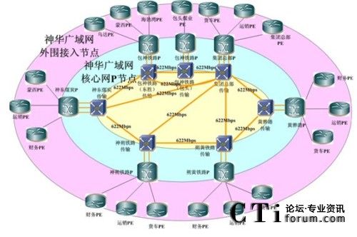 據(jù)神華集團(tuán)信息管理部廣域網(wǎng)項(xiàng)目負(fù)責(zé)人說:“該項(xiàng)目建成后將是一個建設(shè)在高速傳輸網(wǎng)平臺之上,并利用其提供的線路構(gòu)成廣域網(wǎng)核心節(jié)點(diǎn)之間的互聯(lián)線路,網(wǎng)絡(luò)拓?fù)湓?個核心節(jié)點(diǎn)和以北京節(jié)點(diǎn)為中心直連7個核心節(jié)點(diǎn)的放射型622M環(huán)形+放射混合性企業(yè)頂級骨干廣域數(shù)據(jù)網(wǎng)絡(luò)結(jié)構(gòu)。該網(wǎng)絡(luò)結(jié)構(gòu)可避免任一段光纜中斷造成某節(jié)點(diǎn)直連線路和環(huán)線同時中斷的可能性,即對網(wǎng)絡(luò)單點(diǎn)故障實(shí)現(xiàn)環(huán)路保護(hù)。同時,網(wǎng)絡(luò)中斷到恢復(fù)的周期大大縮短:傳輸系統(tǒng)中SDH的環(huán)路自愈從中斷到恢復(fù)周期為50ms,網(wǎng)絡(luò)節(jié)點(diǎn)之間通過IGP的路由收斂,從中斷到恢復(fù)的周期約為200ms!