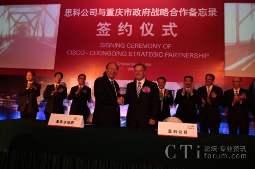 CTI論壇(ctiforum)9月14日消息:2009年9月11日,重慶市人民政府與思科正式簽訂合作備忘錄,雙方將結(jié)為戰(zhàn)略合作伙伴關(guān)系,就通信產(chǎn)品制造、“智能+互聯(lián)城市”試點(diǎn)示范、綠色技術(shù)研發(fā)與創(chuàng)新及風(fēng)險(xiǎn)投資等多方面展開(kāi)深入合作。此次合作將進(jìn)一步加快重慶市產(chǎn)業(yè)結(jié)構(gòu)和產(chǎn)品結(jié)構(gòu)調(diào)整,促進(jìn)內(nèi)陸開(kāi)放城市建設(shè);加快發(fā)展重慶通信產(chǎn)品產(chǎn)業(yè)集群,把重慶建設(shè)成為西部重要的現(xiàn)代通信產(chǎn)品制造基地;推動(dòng)以信息產(chǎn)業(yè)為主體的重慶高新技術(shù)產(chǎn)業(yè)發(fā)展以及本土創(chuàng)新和可持續(xù)性能力的提供,更高效便捷地加快本土企業(yè)的國(guó)際化進(jìn)程;整合多方國(guó)際資源,以推進(jìn)重慶在中國(guó)率先成為“智能+互聯(lián)城市”,讓市民享受更多的工作和生活便利及實(shí)惠。作為思科在華創(chuàng)新及可持續(xù)發(fā)展戰(zhàn)略實(shí)施的又一里程碑,此次合作不僅是思科“智能+互聯(lián)城市”計(jì)劃在中國(guó)與當(dāng)?shù)卣氖锥群献黜?xiàng)目,也是思科在“協(xié)作型創(chuàng)新模式”指導(dǎo)下激勵(lì)本土創(chuàng)新的全新實(shí)踐。