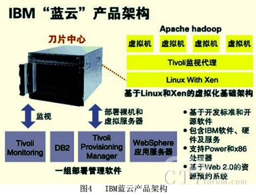 通過(guò)IBM的技術(shù)白皮書(shū),我們可以一窺藍(lán)云計(jì)算平臺(tái)的內(nèi)部構(gòu)造!八{(lán)云”建立在IBM大規(guī)模計(jì)算領(lǐng)域的專業(yè)技術(shù)基礎(chǔ)上,基于由IBM軟件、系統(tǒng)技術(shù)和服務(wù)支持的開(kāi)放標(biāo)準(zhǔn)和開(kāi)源軟件。簡(jiǎn)單地說(shuō),“藍(lán)云”基于IBM Almaden研究中心(Almaden Research Center)的云基礎(chǔ)架構(gòu),包括Xen和PowerVM虛擬化、Linux操作系統(tǒng)映像以及Hadoop文件系統(tǒng)與并行構(gòu)建!八{(lán)云”由IBM Tivoli軟件支持,通過(guò)管理服務(wù)器來(lái)確保基于需求的最佳性能。這包括通過(guò)能夠跨越多服務(wù)器實(shí)時(shí)分配資源的軟件,為客戶帶來(lái)一種無(wú)縫體驗(yàn),加速性能并確保在最苛刻環(huán)境下的穩(wěn)定性。IBM新近發(fā)布的“藍(lán)云(Blue Cloud)”計(jì)劃,能夠幫助用戶進(jìn)行云計(jì)算環(huán)境的搭建。它通過(guò)將Tivoli、DB2、WebSphere與硬件產(chǎn)品(目前是x86刀片服務(wù)器)集成,能夠?yàn)槠髽I(yè)架設(shè)一個(gè)分布式、可全球訪問(wèn)的資源結(jié)構(gòu)。根據(jù)IBM的計(jì)劃,首款支持Power和x86處理器刀片服務(wù)器系統(tǒng)的“藍(lán)云”產(chǎn)品將于2008年正式推出,并且計(jì)劃隨后推出基于System z“大型主機(jī)”的云環(huán)境,以及基于高密度機(jī)架集群的云環(huán)境。