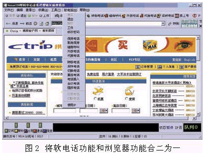 攜程呼叫中心在規(guī)劃設(shè)計時也在考慮,如何將座席業(yè)務(wù)代表的操作和電話功能進行有機結(jié)合。攜程旅行網(wǎng)的內(nèi)部系統(tǒng)采用B/S結(jié)構(gòu)編寫,不同于一般通用的C/S結(jié)構(gòu)軟件。如果為了實現(xiàn)CTI而改用C/S結(jié)構(gòu),一方面工作量較大,另一方面還需要進行大量的重新培訓(xùn)工作。為解決這個問題,采用了將軟電話功能和瀏覽器功能合二為一的方案,如圖2所示。