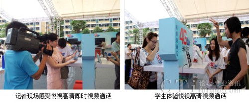 這次在廣州大學城開展的發(fā)布會,吸引了很多在校大學生的參加,下圖是記者和學生現(xiàn)場體驗通過悅視高清視頻通話玩即時猜拳游戲,傳輸的所有畫面非常清晰流暢,悅視產品的優(yōu)質體驗讓人享受無線高質量流媒體服務的同時深刻感受到TD-LTE高帶寬、低時延的優(yōu)勢。