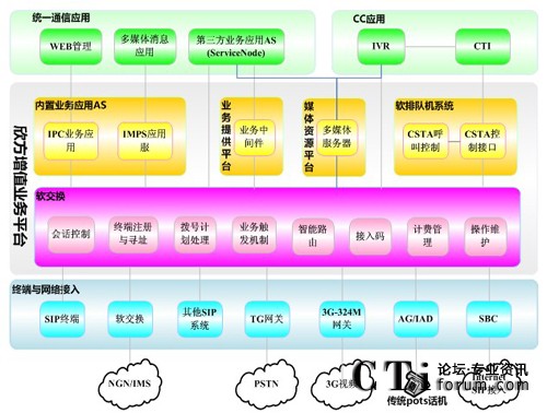 欣方增值業(yè)務(wù)平臺(tái)采用下一代網(wǎng)絡(luò)技術(shù)和開(kāi)放、分層的架構(gòu),涵蓋了呼叫接入、媒體處理、核心會(huì)話控制、業(yè)務(wù)應(yīng)用及開(kāi)發(fā)等NGN體系中所有內(nèi)容,是一套基于SIP增值業(yè)務(wù)提供的完整平臺(tái),包括核心控制系統(tǒng)(軟交換)、媒體資源處理系統(tǒng)、業(yè)務(wù)運(yùn)行環(huán)境、業(yè)務(wù)中間件及開(kāi)發(fā)環(huán)境等業(yè)務(wù)提供與部署的重要設(shè)施,其中: