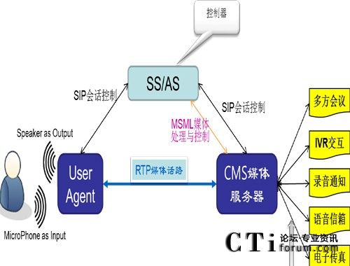 通過呼叫控制接口,軟交換/AS可以將用戶終端和CMS建立RTP話路,然后再通過媒體控制接口指示CMS進行相應的媒體處理,比如放音、收號、錄音以及搭接會議橋等。