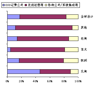 圖1、無線OSS計(jì)費(fèi)市場(chǎng):2000年全球按照地區(qū)劃分的不同公司類型的整體市場(chǎng)收入估計(jì)(百萬(wàn)美元)