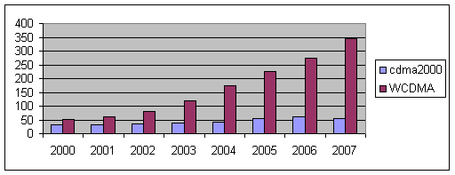 2000年,3G市場收入在cdma2000(大約31億美元,占38%)與WCDMA(大約50億美元,占62%)分布為1/3比2/3。我們不難看出,這種變化有利于WCDMA。到2007年,預(yù)計(jì)WCDMA將占全部市場收入的86%。這是由于對于WCDMA,運(yùn)營商需要增加支出來將其網(wǎng)絡(luò)升級為GPRS、EDGE與WCDMA。同時(shí),在預(yù)測期內(nèi),TDMA運(yùn)營商最終要將其所有現(xiàn)存的TDMA與模擬特性升級為GSM/GPRS。相比之下,CDMA運(yùn)營商處于良好的狀態(tài),其現(xiàn)有基礎(chǔ)設(shè)施的大部分軟件已經(jīng)升級。CDMA運(yùn)營商,如Verizon,確實(shí)也有模擬特性,但是較之GSM/TDMA而言,它們要低得多。CDMA運(yùn)營商支出的大部分將以新的Cell sites的形式出現(xiàn)的覆蓋率。