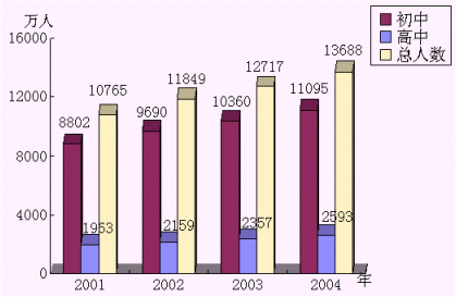 從教育部《2002年全國教育事業(yè)發(fā)展統(tǒng)計公報》來看,我國的教育市場發(fā)展迅速,特別是高中階段教育增長率為21.28%,而高等教育增長率為16.93%以上,其中普通高等教育招生320.50萬人,比上年增加52.22萬人,增長19.46%; 2001年,中國大陸中學學生人數(shù)已達10765萬人,而且學生人數(shù)還在快速增長。初中學生人數(shù)以每年6.5%的速度增長,普通高中學生人數(shù)也以每年10%-11%的速度增長?梢钥闯觯逃袌鼍薮蟮臐摿蜕虣C。