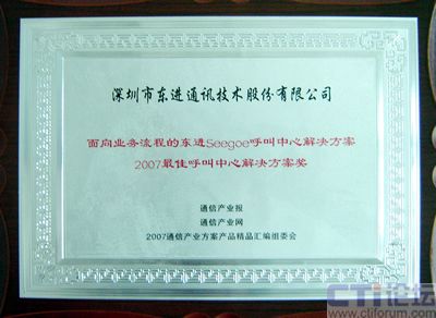 10月23日,中國國際通信設備技術展覽會國際通信展覽會開幕當天,由通訊產業(yè)報社主辦的2007通信產業(yè)方案產品精品評選活動頒獎典禮隆重舉行,東進技術的“面向業(yè)務流程的東進Seegoe呼叫中心解決方案”榮獲2007最佳呼叫中心解決方案獎。