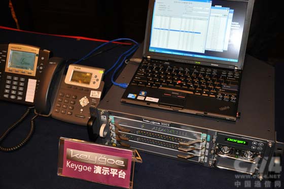 現(xiàn)場兩套演示系統(tǒng)中,一套以Keygoe 3000系列機(jī)箱承載最新研發(fā)的高密度VoIP資源處理板PFBT480X,實現(xiàn)整機(jī)最大1920路VoIP語音處理,展示了keygoe 3000多媒體交換機(jī)在大容量IP呼叫和語音處理的卓越性能。另一套則展示了最新的Keygoe1001系列多媒體交換機(jī),該機(jī)通過內(nèi)置主控CPU板,將語音交換、語音處理以及應(yīng)用程序整合在一個高為1U的物理機(jī)箱中,為中小型規(guī)模業(yè)務(wù)應(yīng)用提供具有較強(qiáng)綜合性、靈活性和完整性的運(yùn)營平臺。