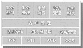 從技術(shù)實現(xiàn)的角度,劃分為四層。依次為呼叫中心系統(tǒng)層,應(yīng)用管理層、客戶管理層和業(yè)務(wù)應(yīng)用層。