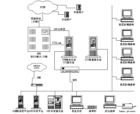 在整個系統(tǒng)中北京聯(lián)訊創(chuàng)新公司承擔(dān)了奧星天網(wǎng)GPS信息服務(wù)系統(tǒng)的呼叫中心系統(tǒng)(CALL CENTER)的籌建。