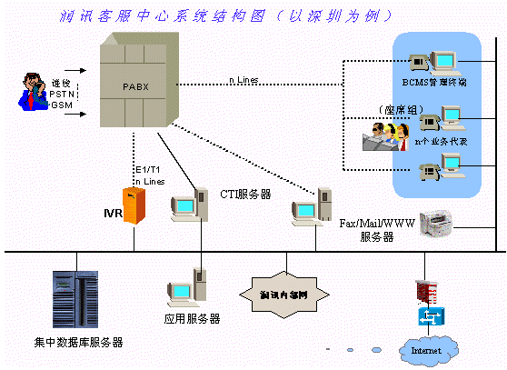 第一階段完成對廣州、深圳、上海和北京四地的客戶服務中心內(nèi)所有系統(tǒng)的設計、開發(fā)、實施和對潤訊相關人員進行外包業(yè)務的咨詢顧問工作。第二階段完成對其在國內(nèi)其它27個城市的客戶服務中心的建設。