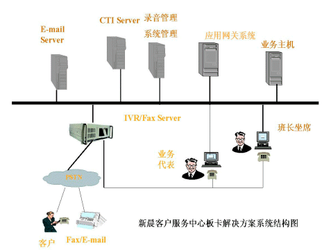 新晨客戶服務(wù)中心普及型解決方案是在以專(zhuān)用交換機(jī)或PC服務(wù)器加語(yǔ)音卡作為電話接入設(shè)備,如果用PC服務(wù)器加語(yǔ)音卡作為電話接入設(shè)備,將電話中繼線直接接到IVR上。此方案中的CTI系統(tǒng)能夠適用于流行的語(yǔ)音板卡和多種電話交換機(jī)的不同環(huán)境,這種解決方案主要針對(duì)小型的客戶服務(wù)中心推出。