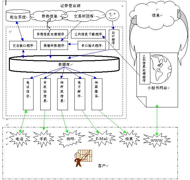 面對越來越激烈的競爭,各個券商使出渾身解數(shù),推出如透支、手續(xù)費返還等各種吸引客戶的手段;運用各種各樣的的交易方式如:營業(yè)部大戶室、家庭遠程大戶室、網(wǎng)上交易、電話委托以及手機炒股、股易通、WAP網(wǎng)上交易等等。然而,這些都屬于被動的服務方式,對于業(yè)余炒股的大多數(shù)中小戶、散戶來說,不可能每天花數(shù)小時瀏覽股市的各種信息。因此,不知道配股繳款、錯過配售新股等情況時有發(fā)生,給客戶造成較大的經(jīng)濟損失;一些重大消息、重大新聞不能及時獲知,延誤了投資的有利時機。據(jù)調查,目前參加二級市場配售的投資者比例不足20%。