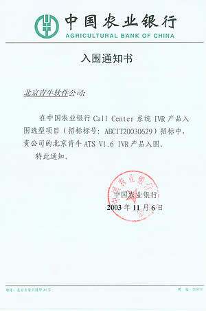青牛軟件成功入圍中國(guó)農(nóng)業(yè)銀行Call Center產(chǎn)品選型
