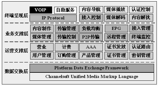 b) 針對電信和廣電市場,提供大型的分布式電信級IPTV解決方案。在技術架構上為電信和廣電合作運營提供了強大的平臺支持,可以實現(xiàn)多家內容和網絡運營商共享用戶、進行多級認證、雙方計費核對的復雜商業(yè)模式。主要應用領域為基于IP寬帶網的交互網絡電視。