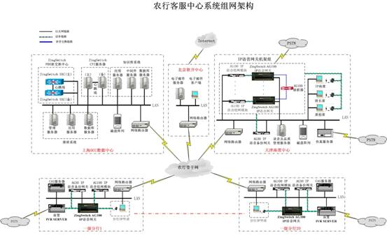 中國農(nóng)業(yè)銀行一體化客戶服務(wù)中心一期工程包括PBX、CTI、錄音及品質(zhì)管理、排班、知識(shí)庫、電子郵件等子系統(tǒng),主要部署在數(shù)據(jù)中心(上海)、中國農(nóng)業(yè)銀行客戶服務(wù)中心(天津)、20個(gè)一級(jí)分行。按照業(yè)務(wù)需求以及發(fā)展的規(guī)劃,農(nóng)行一體化客戶服務(wù)中心的核心設(shè)備部署在上海DCC數(shù)據(jù)中心,IVR系統(tǒng)前置部署在各分行,座席集中部署在天津座席中心,為全國客戶提供人工服務(wù)。各分行的人工座席對(duì)客戶提供各地分行特色業(yè)務(wù)的人工服務(wù),各分行人工座席統(tǒng)一接受總中心的管理調(diào)度,各座席群組可以相互間溢出或轉(zhuǎn)移。