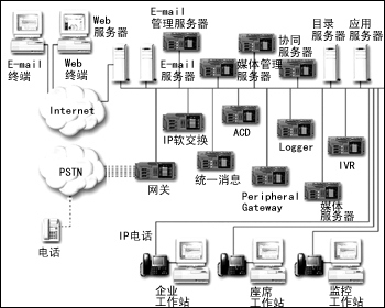 從上面的圖1、圖2中,可以看到IP通信大大簡化了企業(yè)的網(wǎng)絡(luò)通信結(jié)構(gòu)。但是為了實現(xiàn)不同的功能和應(yīng)用,網(wǎng)絡(luò)中仍然存在很多的服務(wù)器,各個品牌不同功能的服務(wù)器之間的協(xié)同成為最顯著的問題,同時維護(hù)和運行這樣大量的設(shè)備也需要大量的資源支持。而且,這僅是單點的客戶服務(wù)中心所需的配備,而在基于IP通信的分布式客戶服務(wù)中心的構(gòu)建中,所涉及的設(shè)備更多。