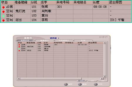 班長席子系統(tǒng)除了話務(wù)席子系統(tǒng)中所介紹的全部功能外,還具有監(jiān)聽、錄音、強(qiáng)拆電話、攔截呼叫、話務(wù)席監(jiān)控、話務(wù)工作量統(tǒng)計(jì)等座席管理功能。