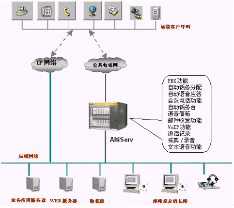 該系統(tǒng)包括 ALTISERVE®、IVR、 自動傳真、 智能選擇坐席ACD、 來電號碼的顯示、監(jiān)督系統(tǒng)、客戶資料的查詢與錄入、查詢統(tǒng)計、現(xiàn)有資源的集成、開放的 WEB接口等等。 ALTIGEN 高度整合通訊服務器 ALTISERVE® 系統(tǒng),為該客服系統(tǒng)提供了強大的交換功能,同時還集成了多種服務器功能。由于采用自己特有的交換系統(tǒng),使得系統(tǒng)的穩(wěn)定性更好,譬如,湖南株州工商的呼叫中心系統(tǒng)自運行一年多來,從未出現(xiàn)任何故障。另外,尤為出色的是系統(tǒng)具有良好的相容性,克服了諸多廠商生產(chǎn)的交換機相互不兼容的缺陷。因此,系統(tǒng)完全實現(xiàn)了高可靠性、穩(wěn)定性和相容性的國際化水平。