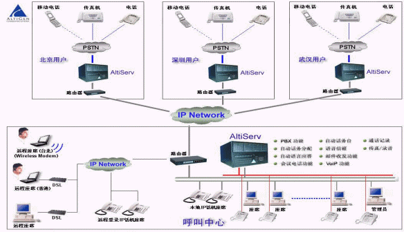 AltiCenter 將奧迪堅(jiān)所倡導(dǎo)的基于IP分布式呼叫中心技術(shù)完美轉(zhuǎn)化為產(chǎn)品,為用戶輕松構(gòu)建基于IP的分布式呼叫中心系統(tǒng)。該呼叫中心不僅提供語音電話,還能提供包括音頻視頻在內(nèi)的多媒體通信;不僅能支持傳統(tǒng)的電話終端,還能支持來自Internet的語音、數(shù)據(jù)信息等多種交互方式;不僅提供了完整的本地座席功能,還提供遠(yuǎn)程IP座席,遠(yuǎn)程IP專家座席,并提供高度統(tǒng)一實(shí)用的呼叫中心管理體系。AltiCenter在設(shè)計(jì)之初就采用IP內(nèi)核的一體化設(shè)計(jì),不需要任何語音網(wǎng)關(guān)設(shè)備,就可以在網(wǎng)絡(luò)上構(gòu)建一個(gè)語音和數(shù)據(jù)的統(tǒng)一平臺(tái),無論在世界的哪個(gè)角落,遠(yuǎn)程IP座席和分布的異地機(jī)構(gòu)都可以共享客戶的所有資源(語音、數(shù)據(jù)、座席),由于采用了先進(jìn)的VoIP技術(shù),可以為各地的電話和Internet的客戶提供統(tǒng)一的客戶號(hào)碼和統(tǒng)一的客戶服務(wù),并極大地降低呼叫中心的運(yùn)營(yíng)成本,真正幫助用戶建立一個(gè)高效的、信息共享的分布式呼叫中心系統(tǒng)。