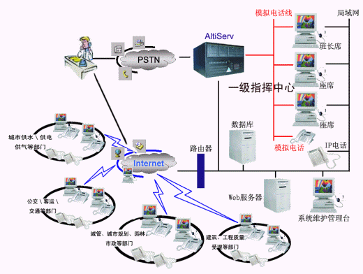 市民打電話進入12319,當(dāng)一級網(wǎng)路系統(tǒng)接到市民求助時,如無法當(dāng)場解決,該系統(tǒng)即迅速向二級網(wǎng)絡(luò)相關(guān)執(zhí)行單位轉(zhuǎn)達市民的求助信息。12319二級網(wǎng)絡(luò)是涉及到城市供水、供氣、供暖、市政、市容、城市交通、園林綠化、城市規(guī)劃、城市執(zhí)法、房管、環(huán)衛(wèi)、路燈、建筑市場、建筑工程質(zhì)量和安全監(jiān)理等多種與市民生活關(guān)系密切的行業(yè),由市建委、規(guī)劃局、城建局、交通局、房產(chǎn)局、行政執(zhí)法局、人防辦、路燈局、自來水公司、煤氣公司、公交、客運等部門。奧迪堅針對分散的眾多部門,采用IP分布式呼叫中心技術(shù),完全支持遠程IP座席,各職能部門的座席可以實現(xiàn)本地服務(wù),不需要集中在12319服務(wù)中心。對于各部門IP座席來說,無需任何特殊IP模塊,只需要一臺帶有聲卡的電腦或一臺支持H.323協(xié)議的IP話機,通過Internet登錄到12319中心系統(tǒng)端,方便地處理來電和數(shù)據(jù),當(dāng)接到市民的求助信息,就可以使問題迅速進入處理程序,通知下屬的專業(yè)搶修服務(wù)隊(三級網(wǎng)絡(luò))進行搶修,在解決市民的問題同時向有關(guān)監(jiān)督部門發(fā)出相同信息,利于督辦落實。