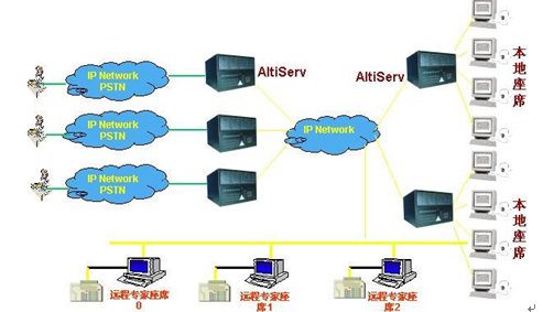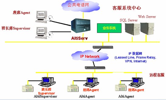 這種組合節(jié)省管理成本,因?yàn)樗械淖瘑T都在一點(diǎn),便于管理控制,同時(shí)用戶只要撥打本地電話即可進(jìn)入系統(tǒng)接收服務(wù),如需人工座席應(yīng)答的話系統(tǒng)會(huì)自動(dòng)將來電通過Internet轉(zhuǎn)接到座席員處,對(duì)公司的話費(fèi)成本也較低(都是通過Internet實(shí)現(xiàn)的長(zhǎng)途轉(zhuǎn)接功能)。同時(shí)AltiGen也支持通過IP分機(jī)的方式遠(yuǎn)程登錄到系統(tǒng)實(shí)現(xiàn)遠(yuǎn)程座席的功能,這樣對(duì)有些高級(jí)話務(wù)員或?qū)<易,不必每天到公司上班,可以通過家里的電腦登錄到AltiGen系統(tǒng),作為系統(tǒng)的一個(gè)分機(jī)來完成所有的座席員的功能,在他的電腦屏幕上也能彈出來電人的信息。系統(tǒng)的組網(wǎng)圖如下: