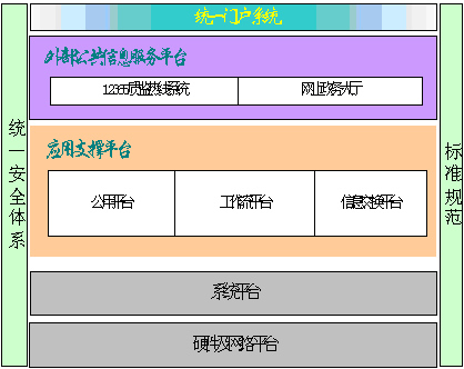 2 )系統(tǒng)基于 J2EE架構(gòu),采取三層結(jié)構(gòu)設(shè)計,分為前端應用(外部公共信息服務平臺)、應用支撐平臺和系統(tǒng)軟硬件平臺,以應用支撐平臺為核心,以安全和標準為保證。