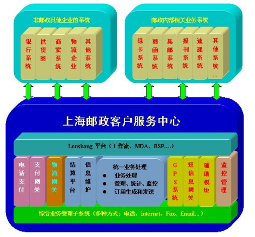 作為上海郵政客戶(hù)服務(wù)中心系統(tǒng),由綜合業(yè)務(wù)受理、統(tǒng)一業(yè)務(wù)處理、多種支付手段、統(tǒng)一物流接口以及多種輔助功能等多個(gè)子系統(tǒng)組成,在設(shè)計(jì)中必須要整體考慮其各子系統(tǒng)之間有機(jī)結(jié)合,以及與其他業(yè)務(wù)系統(tǒng)的信息處理接口。