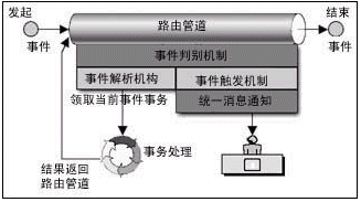 在路由管道中流轉(zhuǎn)著加載了業(yè)務(wù)的工作流事件。事件按照事先定義的路由規(guī)則流轉(zhuǎn),事件的路由規(guī)則定義了事件在路由管道中可以?康摹罢九_(tái)”,同時(shí)定義了事件到達(dá)“站臺(tái)”時(shí)可以領(lǐng)取并處理加載在事件上的業(yè)務(wù)的角色。事件從始發(fā)站臺(tái)進(jìn)入路由管道,經(jīng)過一個(gè)或多個(gè)中間站臺(tái),最后到達(dá)終點(diǎn)站。事件每?恳粋(gè)站臺(tái),相關(guān)人員領(lǐng)取事務(wù),并進(jìn)行處理后重新裝載事務(wù),觸發(fā)事件向下一個(gè)站臺(tái)流轉(zhuǎn),除非事件已經(jīng)到達(dá)終點(diǎn)站。