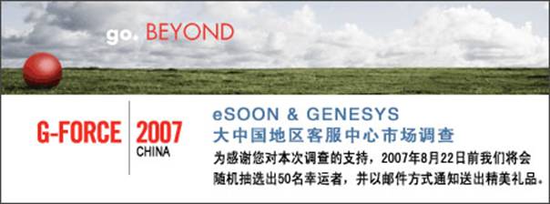 “eSOON & GENESYS 大中國(guó)地區(qū)客服中心市場(chǎng)調(diào)查”誠(chéng)意邀請(qǐng)您不吝賜教,花幾分鐘時(shí)間提供您的寶貴意見并填寫。為感謝您對(duì)eSOON & GENESYS的支持,2007年8月22日前我們將會(huì)隨機(jī)抽選出50名幸運(yùn)者, 并以郵件方式通知送出精美禮品。