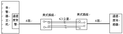 溫、濕度傳感器通過(guò)四蕊電話(huà)線與告警器主機(jī)相連。兩者距離很近時(shí),將傳感器接線插入主機(jī)溫、濕度告警接口即可。若距離不夠長(zhǎng)時(shí),可按上圖一對(duì)一的加長(zhǎng)連線,連線距離可達(dá)3公里。