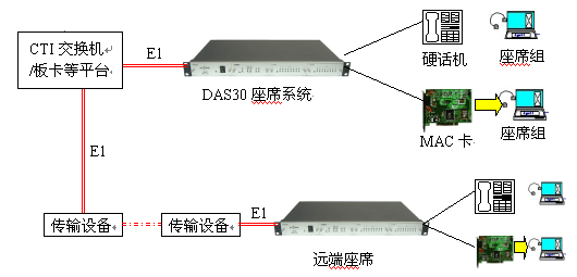 見下圖:DAS30通過1個E1接口與交換機/板卡直接連接,無需配置數(shù)據(jù),可方便地實現(xiàn)本地座席接入或遠端分布式接入(需配合傳輸設備)。終端可為普通電話機或MAC座席電話卡。