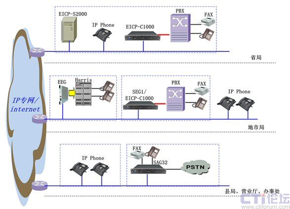 在省局我們采用EICP-S2000或EICP-C1000作為整個(gè)系統(tǒng)的核心服務(wù)器/控制器,并可與原有PBX對(duì)接;在地市局有PBX的地方采用C1000、SEG1或EEG設(shè)備,或用IP話機(jī)直接放號(hào);在縣局、營(yíng)業(yè)廳、辦事處沒(méi)有PBX的地方采用SAG32/SAG8提供模擬用戶接入,或直接采用IP話機(jī)。
