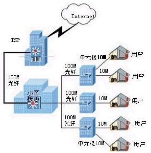 寬帶小區(qū)網(wǎng)絡(luò)建設(shè)采用基于三層交換的千兆以太技術(shù),在小區(qū)核心引入帶光口的千兆以太網(wǎng)交換機(jī),通過(guò)光纖以千兆速率上連至ISP接入?yún)^(qū)域交換機(jī)。小區(qū)內(nèi)部形成星型結(jié)構(gòu),每棟單元樓內(nèi)放置帶百兆光口的以太網(wǎng)交換機(jī),通過(guò)百兆光纖將小區(qū)核心和單元樓連接起來(lái)。樓宇內(nèi)部布放五類(lèi)線,連至用戶(hù)計(jì)算機(jī)的網(wǎng)卡,使最終用戶(hù)上網(wǎng)速率達(dá)到10M或更高。
