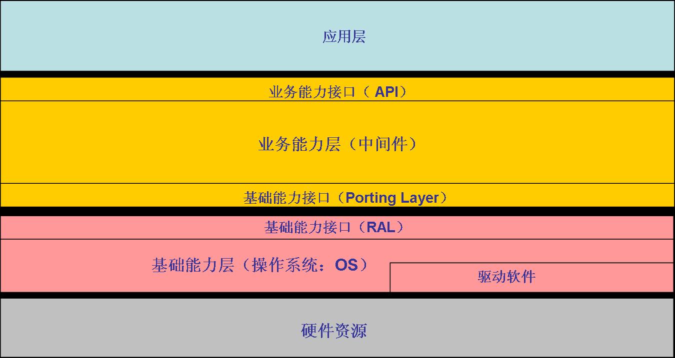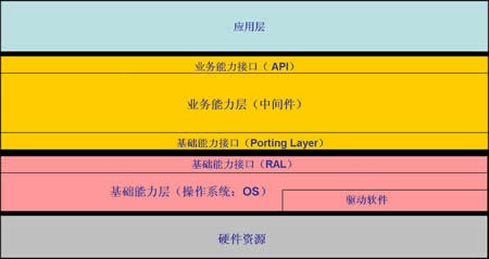 這副圖是我們對中間件的一個架構(gòu),下邊是系統(tǒng)資源層,硬件資源層和軟件資源層都是作為系統(tǒng)資源層,系統(tǒng)資源層之上有個抽象接口,黃色部分就是中間件了,它需要跟下邊搞Porting Layer,也就是可移植層接口,中間部分是各種業(yè)務模塊,對上的話,為了開發(fā)需要打開一個API的公用接口。