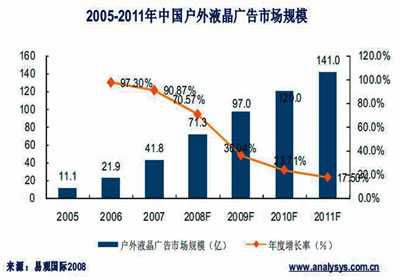根據(jù)易觀國際的數(shù)據(jù),國內(nèi)外液晶廣告市場規(guī)模2007年總產(chǎn)值達(dá)到41億元,處于高速增長期,預(yù)計2011年將達(dá)到141億元,從2005年到2011年戶外液晶廣告市場的平均復(fù)合增長率將達(dá)到37.4%(如表1所示)。