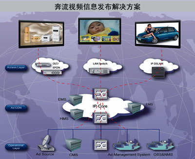 UT斯達(dá)康緊跟市場發(fā)展趨勢和運營商步伐,深入研究戶外液晶廣告業(yè)務(wù)的發(fā)展、大力推進(jìn)廣告平臺的研發(fā)。2006年,UT斯達(dá)康推出了奔流(RollingStream)視頻信息發(fā)布解決方案(如圖2所示)。奔流視頻信息發(fā)布解決方案是以奔流(RollingStream)IPTV平臺為基礎(chǔ),結(jié)合戶外液晶廣告市場需求,融合運營商以視頻為主的綜合信息發(fā)布的需求,真正運營級的電信級解決方案。該方案可以幫助運營商實現(xiàn)融合信息服務(wù)和廣告業(yè)務(wù)的統(tǒng)一運營,幫助運營商開展兼具公益性和盈利性的信息發(fā)布業(yè)務(wù),運營商在推進(jìn)社會信息化、造福公眾的同時,通過視頻廣告的運營,也能獲取盈利。該方案基于電信級平臺的穩(wěn)定性、安全性、擴展性設(shè)計要求,可支持百萬級大規(guī)模部署能力,可提供電信級質(zhì)量保證的服務(wù);該方案基于IP流媒體技術(shù),可通過IP網(wǎng)絡(luò)實時、精準(zhǔn)、互動地投放廣告內(nèi)容,從而可以支持豐富、新穎的廣告運營模式;該方案基于數(shù)字多媒體技術(shù),除了可以發(fā)布視頻廣告,還可以發(fā)布圖片、文字、消息等廣告內(nèi)容。