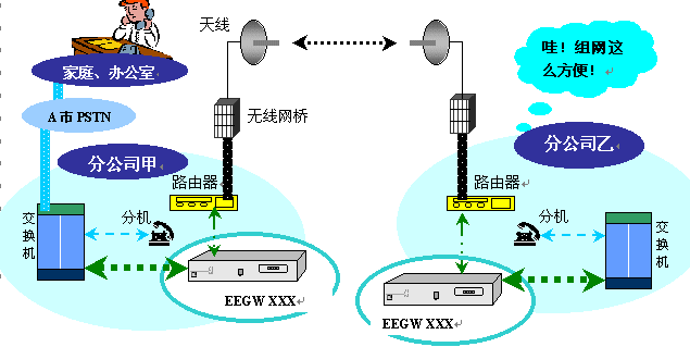 現(xiàn)今的計算機網(wǎng)絡(luò)建設(shè)中,多以DDN為主的局域網(wǎng)互連,往往由于DDN線路不能到達(dá)或要求專用內(nèi)部通道等原因,建設(shè)以無線為室外主要網(wǎng)絡(luò)通道的數(shù)據(jù)通信平臺,配合IP語音網(wǎng)關(guān)形成內(nèi)部的語音通信系統(tǒng),不僅建設(shè)簡單(無須各種市政管理部門的批復(fù)),并且造價較低,快速有效地解決數(shù)據(jù)互連及建立專用安全保密的內(nèi)部語音系統(tǒng)。