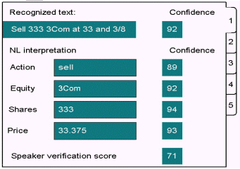 也可使用外部的應(yīng)用知識(shí)內(nèi)容來(lái)確定多結(jié)果中的哪一個(gè)是有效的。例如,經(jīng)紀(jì)業(yè)務(wù)應(yīng)用程序,它的用戶投資隨時(shí)間變化而變化。系統(tǒng)可使用簡(jiǎn)單的語(yǔ)法來(lái)識(shí)別股票證券的名稱。識(shí)別時(shí),系統(tǒng)產(chǎn)生一個(gè)最佳前N個(gè)股票名稱的清單,標(biāo)明假設(shè)的股票證券名稱。應(yīng)用程序然后將每個(gè)清單項(xiàng)目(由最佳到最差)和現(xiàn)有股票證券名稱進(jìn)行比較,從而為該用戶找到可能性最大的一個(gè)。下圖展示的是這些多結(jié)果情況,每個(gè)結(jié)果都可能有它自身的已被識(shí)別的文本、NL解釋和置信度分值。在這一例中,請(qǐng)求了五個(gè)識(shí)別結(jié)果。