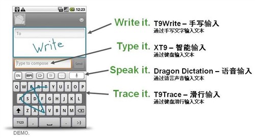 楊先生:Nuance T9 Trace解決了觸屏手機(jī)輸入文字的用戶體驗(yàn),適應(yīng)各種使用環(huán)境。另外,T9 Trace作為 XT9的插件,借助XT9的強(qiáng)大引擎提供周邊鍵盤自動(dòng)的糾錯(cuò)功能,它可以會(huì)根據(jù)按鍵組合智能猜測(cè)您所需要輸入的文字。我們可以看到國(guó)內(nèi)好多手機(jī)的屏幕都非常小,2000元級(jí)別的手機(jī)屏幕大概是2.8英寸甚至2.5英寸,如果你要點(diǎn)命中的機(jī)會(huì)率更低了。所以滑行上來講可以某程度上解決這方面的問題。所以我們覺得這個(gè)滑行輸入法很有潛能的,特別是在中低端的Android平臺(tái)機(jī)型上。