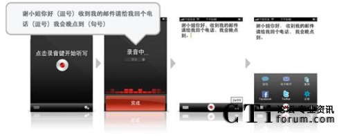 聲龍(Dragon)系列應(yīng)用軟件是基于Nuance著名的Dragon NaturallySpeaking® 語(yǔ)音軟件開(kāi)發(fā)的應(yīng)用,借助語(yǔ)音識(shí)別技術(shù),用戶在輕松自然說(shuō)話時(shí),就可將語(yǔ)音即時(shí)轉(zhuǎn)換成要發(fā)送的短信文本或電子郵件,更新社交網(wǎng)絡(luò)狀態(tài)和進(jìn)行網(wǎng)絡(luò)搜索。事實(shí)證明,語(yǔ)音識(shí)別的速度比使用鍵盤輸入文字快上五倍以上。