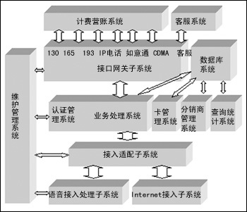 綜合付費(fèi)平臺(tái)的軟件邏輯結(jié)構(gòu)分為語音接入處理子系統(tǒng)、Internet 接入子系統(tǒng)、接入適配網(wǎng)關(guān)子系統(tǒng)、認(rèn)證管理子系統(tǒng)、業(yè)務(wù)處理系統(tǒng)、卡管理系統(tǒng)、分銷商管理系統(tǒng)、查詢統(tǒng)計(jì)系統(tǒng)、數(shù)據(jù)庫系統(tǒng)、接口網(wǎng)關(guān)子系統(tǒng)和維護(hù)管理子系統(tǒng)。