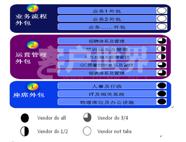所以雙方在選擇的初始過程當中就外包業(yè)務(wù)的戰(zhàn)略和目標進行明確地溝通,達到雙方地一致理解和認同,是成功的第一步。