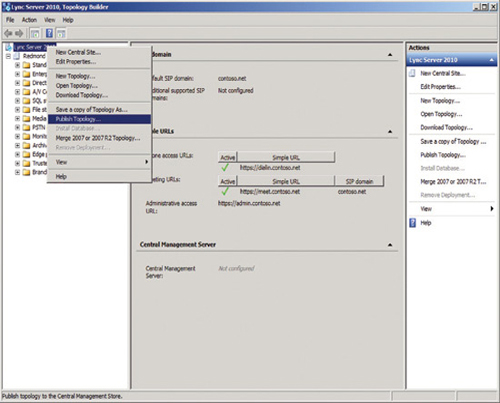 感到滿意后,可使用拓?fù)渖善鱽眚?yàn)證拓?fù)洹H绻鳛橛行負(fù)渫ㄟ^驗(yàn)證,則可以發(fā)布。發(fā)布拓?fù)鋾r,Lync Server 會將拓?fù)浯嫒胫醒牍芾泶鎯ΑH绻形磩?chuàng)建中央管理存儲,Lync 會在您提供有效拓?fù)洳?zhǔn)備發(fā)布拓?fù)鋾r創(chuàng)建中央管理存儲。在所處環(huán)境的各臺服務(wù)器上安裝 Lync Server 時,服務(wù)器會從中央管理存儲讀取拓?fù),并安裝自身以配合其在您的部署中的角色。
