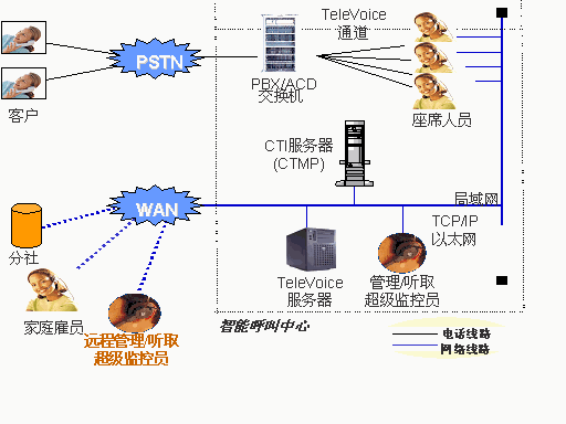 遠程家庭辦公雇員支持:錄音裝備和家庭辦公雇員個人電腦之間,通過專用線、ADSL 或 ISDN 等, 甚至把在家進行的通話內(nèi)容存放到總部的服務器中做錄音保存和控制