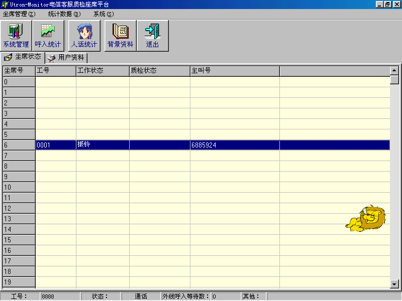 。。座席應(yīng)答時,在當(dāng)前座席座席端上顯示系統(tǒng)分配的客戶隊列和在線的客戶信息。同時,通過客戶管理功能,還可以對系統(tǒng)存儲的客戶信息進(jìn)行維護(hù)和管理。
