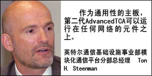 “目前我們是業(yè)內(nèi)第一家推出第二代AdvancedTCA產(chǎn)品的廠家”,英特爾通信基礎(chǔ)設(shè)施事業(yè)部模塊化通信平臺(tái)分部(MCPD)總經(jīng)理Ton H. Steenman說。